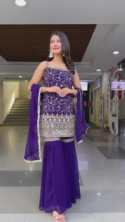 Introducing the Bhavya-RT Foux Gorgette ensemble—a stunning three-piece set designed for the modern woman who celebrates tradition with style. The elegantly crafted top features luxurious foux gorgette fabric with intricate thread and sequin embroidery, paired with a comfortable micro inner lining. Available in sizes M through 3XL with reinforced sleeves for durability. The matching sharara showcases the same exquisite thread and sequin work with full stitching and elastic waistband for a flattering fit up to size 44. Complete your look with the coordinating 2.2-meter dupata, adorned with four-sided lace borders and matching embellishments. Perfect for weddings, celebrations, and special occasions, this set combines comfort, elegance, and timeless appeal in every stitch.