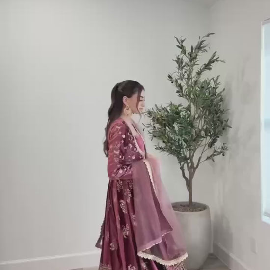 Experience timeless elegance with this Classic Japan Satin Anarkali, crafted from luxurious Japan satin and lined with soft micro cotton for exceptional comfort. Intricate threadwork adorned with sequins adds a delicate shimmer, making it perfect for special occasions. The 52-inch length enhances its graceful flow, available in sizes M to XXL, with a custom-fit option in 3XL. Complementing the ensemble is a 2.2-meter soft butterfly net dupatta, finished with exquisite four-sided lace embroidery, adding a refined touch to your look. Combine style and comfort effortlessly with this stunning traditional outfit.