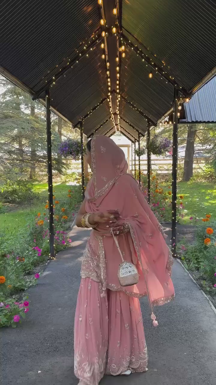 Elevate your festive wardrobe with this Designer Party Wear Suit crafted from heavy faux georgette adorned with intricate 5 mm sequence and rivet moti embroidery. The top features a comfortable micro cotton inner and full stitching, offering flattering lengths from 37 to 38 inches. Paired with matching sharara palazzo pants with elastic waist and similar rich embroidery, this ensemble ensures both style and ease. Finished with a 2.20-meter dupatta embellished with sequence and elegant cutwork, this set is perfect for making a memorable impression at any celebration.