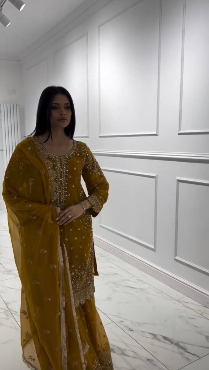 - Work: Heavy embroidery and sequin work with cut work (front side only)