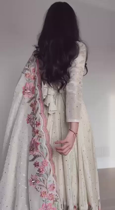 Experience timeless elegance with this fully stitched gown ensemble crafted from pure Cinon silk adorned with intricate 5mm sequence embroidery. Featuring a full-sleeve design and an attached ped for a graceful silhouette, the gown is lined with heavy micro cotton for comfort and measures 50-52 inches in length. Complementing it are heavy butter silk pants with an elastic waistband, offering both style and ease with a 40-41 inch length. The matching pure Cinon silk dupatta, embellished with sequined embroidery, completes this regal look, perfect for any special occasion.
