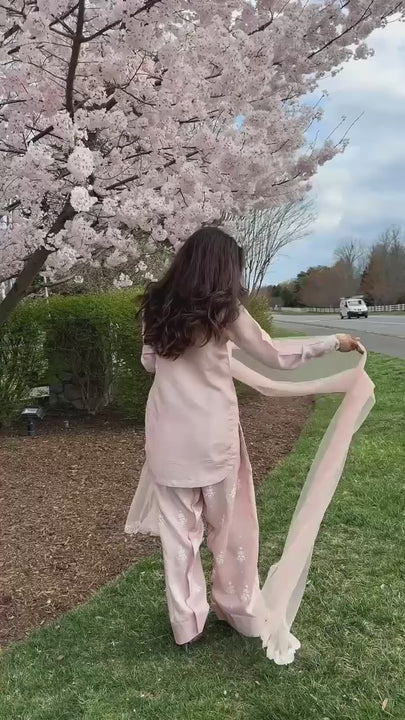 Elevate your festive wardrobe with this Elegant Partywear Farshi Salwar Set crafted from pure Roman silk. The top features intricate embroidery and sequin work on a fully stitched, full-sleeve design with a comfortable heavy micro cotton lining. The matching farshi salwar, also in Roman silk, offers a flattering 40-inch length with elastic for ease. Completing the ensemble is a soft taby silk dupatta adorned with delicate embroidery and sequin accents along the cut border. Available in sizes M to XXL, this ready-to-wear set combines traditional charm with modern comfort for your special occasions.