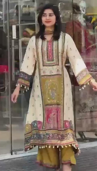 Experience elegance with this Exclusive Kurta Ensemble crafted from pure chinon silk and heavy butter silk. The kurta features exquisite digital prints enhanced by real mirror handwork and hanging lace borders on full sleeves. A heavy micro cotton inner ensures comfort throughout the day. The matching pants boast heavy butter silk with a delicate lace border, perfectly stitched up to XXL size. Completing the set, a pure chinon silk dupatta with fancy digital prints and lace border adds a graceful touch. With thoughtful sizing and rich fabrics, this ensemble blends tradition with contemporary style effortlessly.