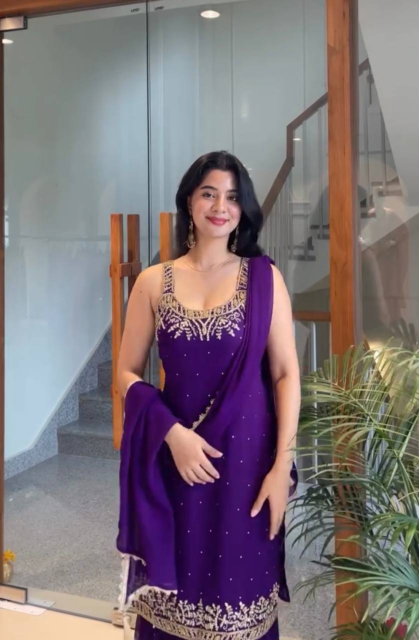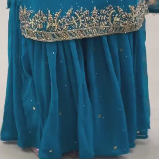 Elevate your festive wardrobe with this exclusive heavy faux georgette sharara ensemble. The fully stitched top features intricate heavy embroidery, sequence, and riveted moti work on the front, layered over a soft micro cotton lining for comfort. Pair it with the matching sharara adorned with riveted moti details and an elastic waist for an easy fit. Complete the look with a heavy faux georgette dupatta, finished with a delicate lace border. Perfect for celebrations, this ensemble combines elegance with comfortable wearability.