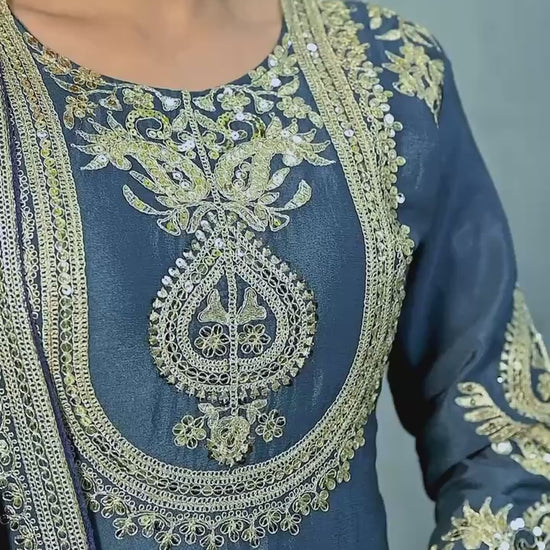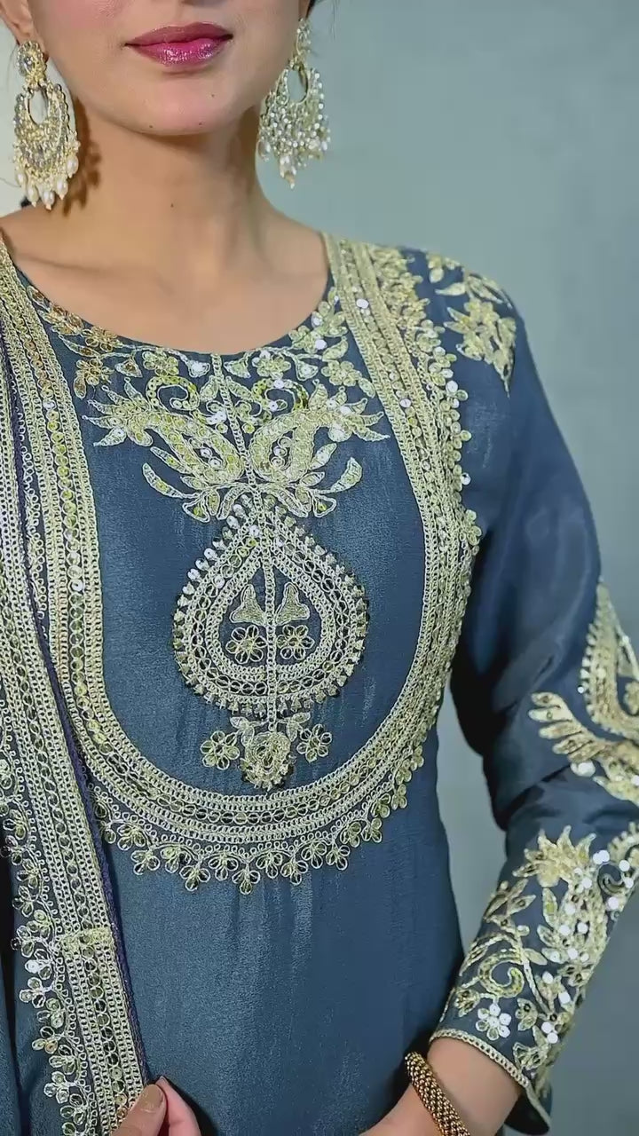 - Fabric: Pure Heavy Chinnon Silk with Heavy Embroidery Coding Sequence Work and Full Embroidery Sleeves