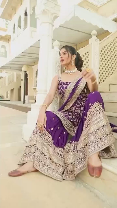 Introducing Kalpi-RT, an exquisite three-piece ensemble crafted for the modern woman who celebrates tradition with style. The intricately embellished top features luxurious faux georgette fabric adorned with shimmering 9mm sequins and precise threadwork, available in sizes M through 3XL with reinforced sleeves for lasting wear. The matching sharara showcases the same elegant sequin detailing with full stitching and comfortable elastic waistband, ensuring a flattering fit up to size 44. Complete your look with the stunning 2.2-meter dupata in faux georgette, beautifully bordered with four-sided lace and sequin embroidery. Perfect for weddings, celebrations, and special occasions, this sophisticated set combines comfort with timeless elegance.