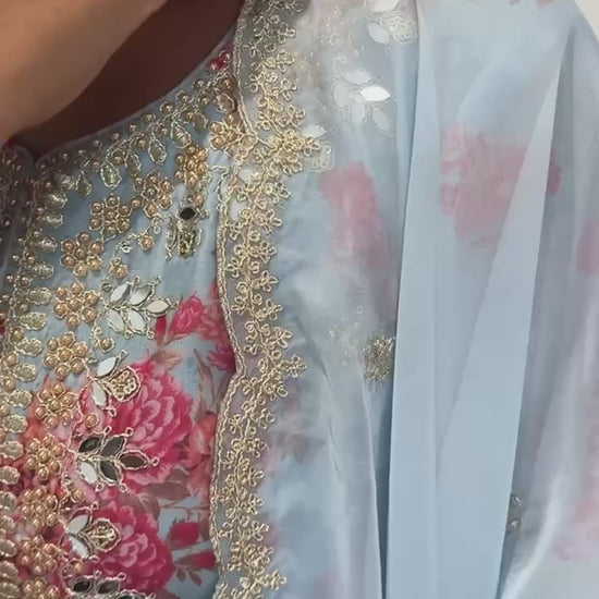 Work: Fancy embroidery with coding dori, sequence, heavy stone mirror handwork, and beautiful digital print