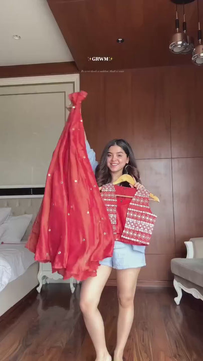 Embrace timeless elegance with this exquisite three-piece lehenga set, meticulously crafted for the discerning bride. The fully-stitched lehenga in luxurious simmer silk features intricate thread work adorned with 9mm sequins, offering a breathtaking 4-meter flair for graceful movement. Complemented by a soft micro-lined inner for comfort, it accommodates sizes up to 44. The unstitched choli and fully-stitched koti, both in matching simmer silk with identical sequin embellishments, complete this regal ensemble. Each piece is designed to drape beautifully and catch light at every turn, making you the center of attention at any celebration. Perfect for weddings, festivals, and special occasions where nothing but the finest will do.