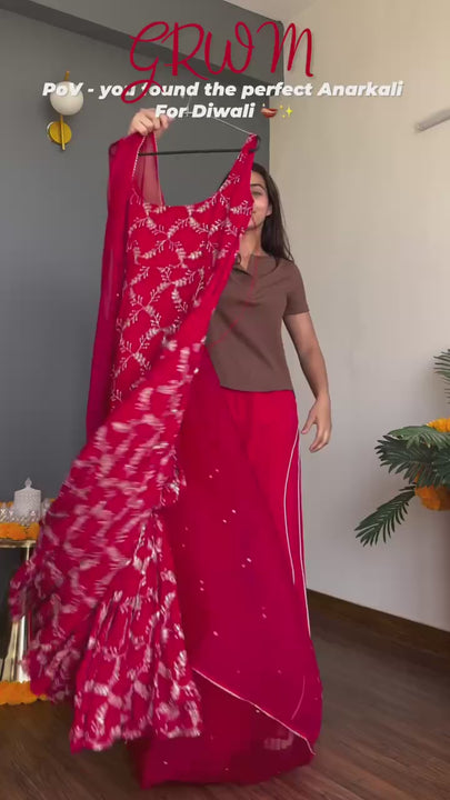 Elevate your ethnic wardrobe with this stunning Sita-RT Anarkali set, crafted for timeless elegance and modern comfort. The anarkali features luxurious foux gorgette fabric with intricate thread and sequin embroidery, paired with a soft micro cotton lining for all-day wearability. Available in sizes M through XXL with a 3XL margin for a custom fit, the 52-inch length offers graceful draping. The coordinating sharara, made from breathable micro cotton with a stretchable elastic waist, ensures a flattering silhouette at 38 inches. Complete the look with the matching 2.2-meter foux gorgette dupatta, adorned with exquisite 4-sided fancy lace border. Extra sleeves are included for versatile styling. Perfect for celebrations, weddings, and special occasions
