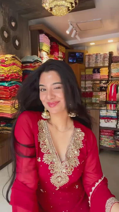Elevate your wardrobe with this Stylish Beaded Faux Georgette Set, featuring intricate hand embroidery, delicate 5 mm sequin work, and elegant rivet moti detailing on the top with sleeves. The top is fully lined with soft micro cotton for comfort, available in sizes M to XXL with a flattering 38-39 inch length. Complementing the top, the embroidered palazzo pants offer a comfortable elastic waist and micro cotton lining, measuring 40-41 inches. Complete the look with a matching heavy faux georgette dupatta, 2.20 meters long, designed with a subtle border for graceful draping. Perfect for special occasions and festive celebrations.
