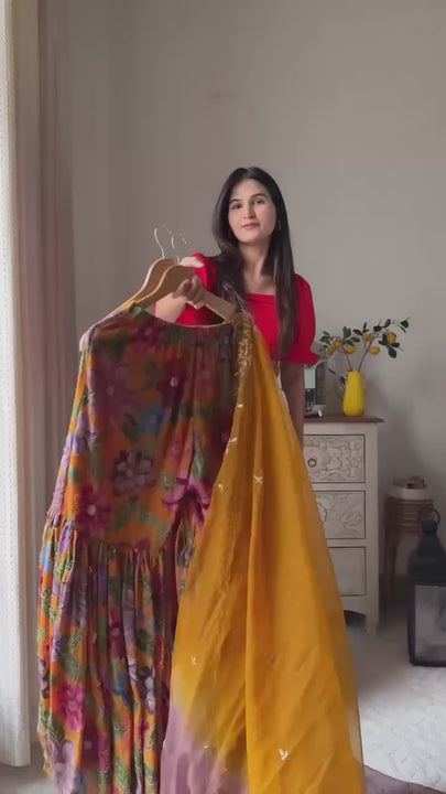 Elevate your festive look with this Stylish Party Wear Sharara Set crafted from pure Chinon Silk. The top features a vibrant fancy digital print enhanced with intricate heavy stone handwork and a comfortable micro cotton lining for all-day wear. The matching sharara, complete with elastic waistband, mirrors the exquisite print and embellishments, ensuring a flawless fit and elegant silhouette. Finished with a heavy faux georgette dupatta adorned with fancy Laheriya digital print and delicate embroidery, this fully stitched ensemble promises a perfect blend of comfort and sophistication for any special occasion.